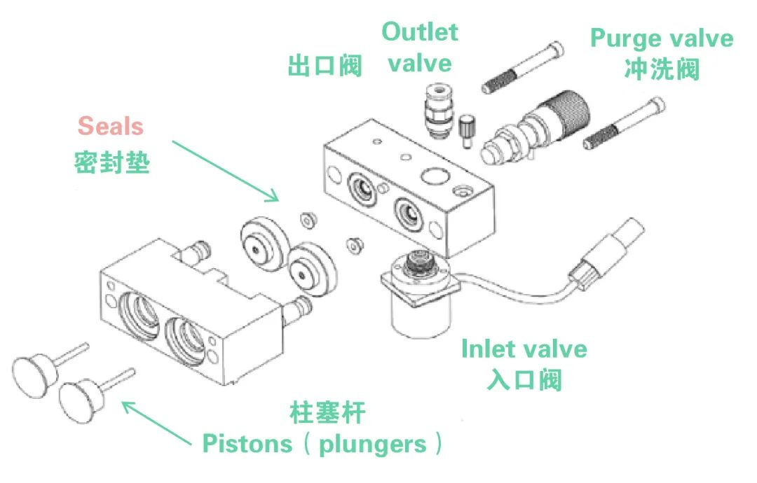 下图以常用的Agilent液相色谱系统泵模块示意图为例(其他模块可能稍有区别):