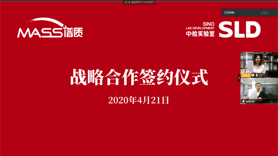 2020年4月21日上午,谱质分析检测技术(上海)有限公司与SLD中检实验室技术举行战略合作协议“云签约”仪式,双方本着平等互利、优势互补的原则,建立战略合作关系,实现资源共享、共同发展,并为以后在其他项目上的合作建立一个坚实的基础。